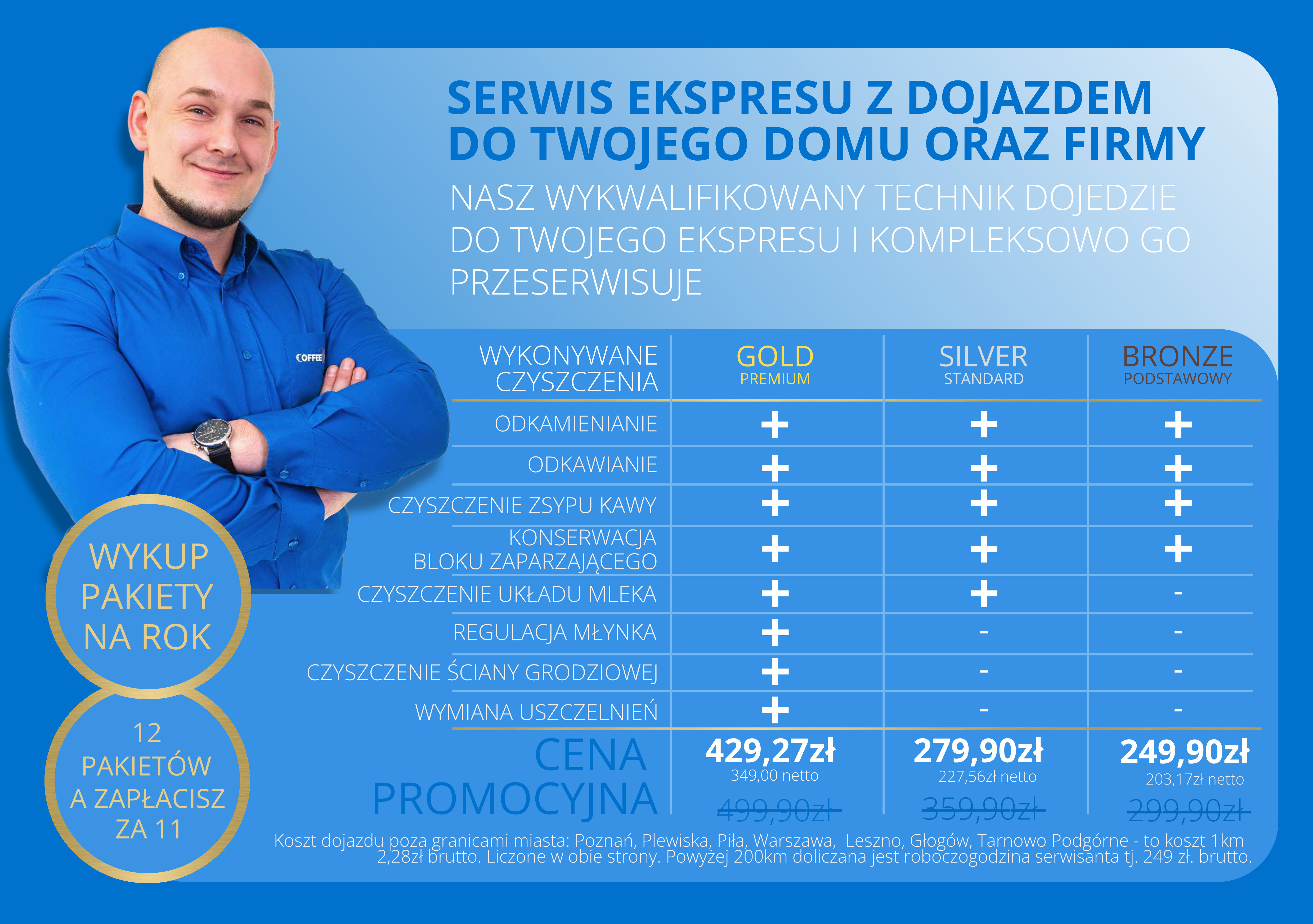 Gdy podczas czyszczenia maszyny u Państwa, technik serwisu stwierdzi, że do wymiany nadają się uszczelnienia i Państwo wyrazicie zgodę na wymianę, zostanie doliczona kwota 185 zł brutto.