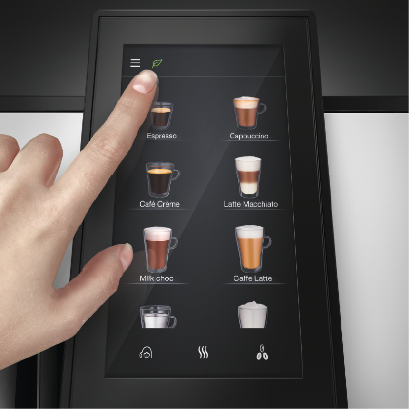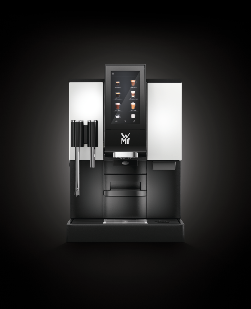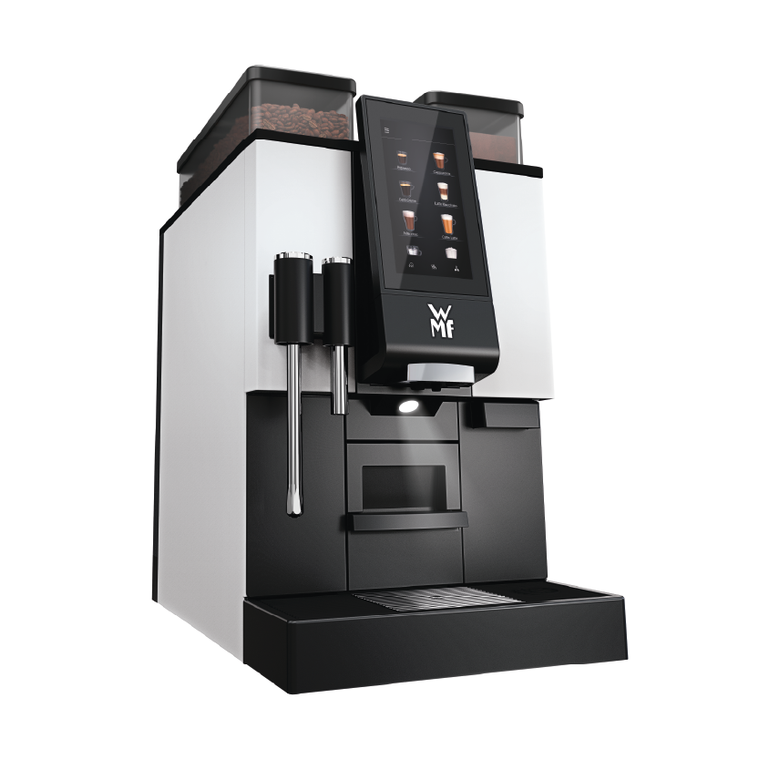 Ekspres wyposażono w pionowy 7‑calowy ekran dotykowy, który działa jak smartfon: przewijanie pionowe, animowane instrukcje, możliwość wgrywania własnych grafik, personalizacja kolorów i układu menu. To sprawia, że WMF 1100 S świetnie sprawdza się zarówno w miejscach samoobsługowych, jak i tam, gdzie kawę przygotowuje personel. Technologia SteamJet błyskawicznie podgrzewa filiżanki naturalną parą, a opcjonalny Basic Steam pozwala ręcznie podgrzewać mleko, napoje i tworzyć piankę jak w ekspresach kolbowych. Oddzielna wylewka gorącej wody (ok. 95°C) umożliwia przygotowanie herbaty i naparów, a dodatkowa półka na filiżanki do 100 mm gwarantuje idealną cremę bez rozprysków. Ekspres obsługuje również kawę mieloną — np. bezkofeinową.