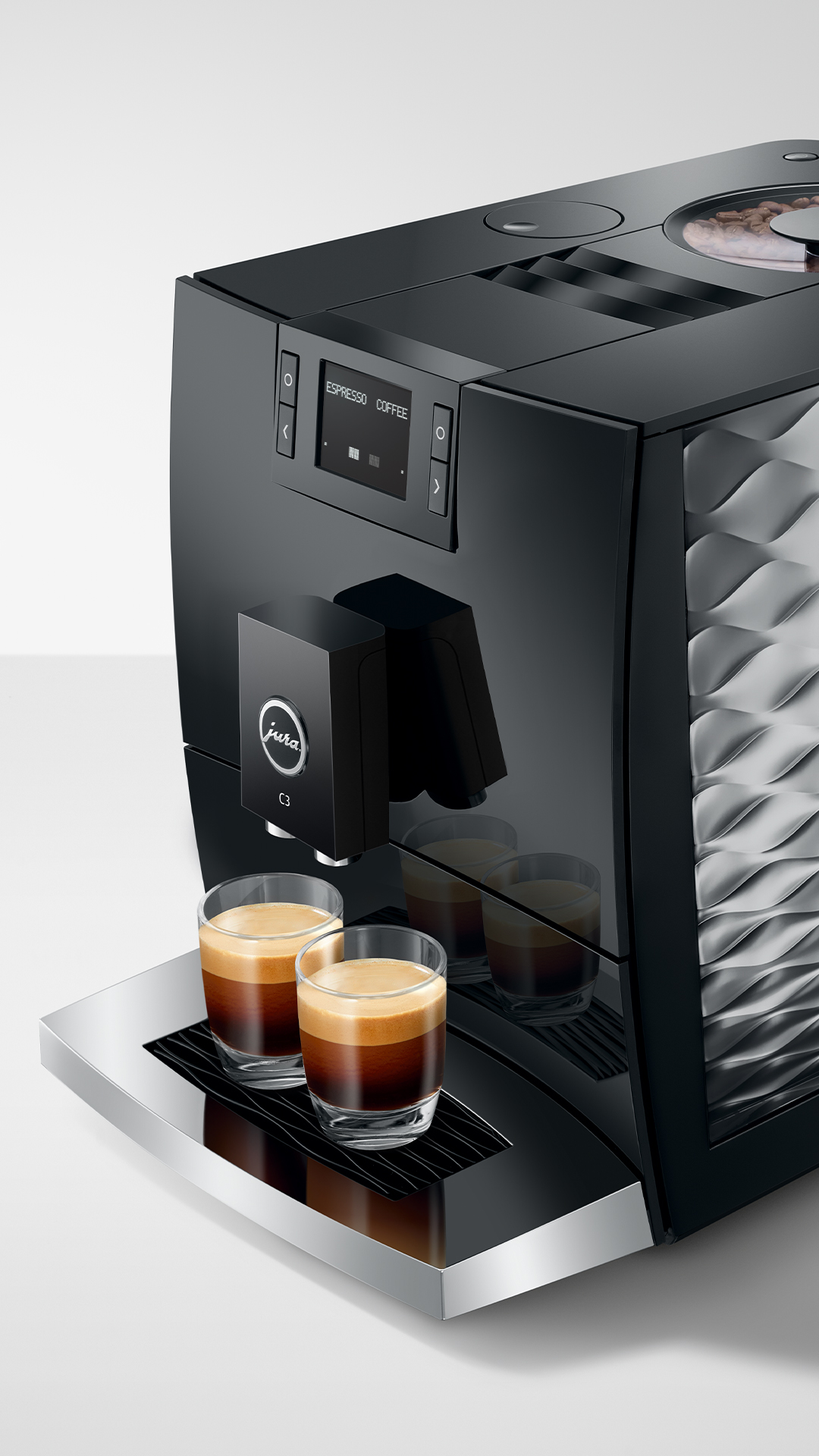 Model C3 wyróżnia się eleganckim, ponadczasowym wzornictwem inspirowanym klasą Premium. Charakterystyczne, falujące linie nadają urządzeniu wyjątkowy wygląd – szczególnie widoczne jest to w kształcie zbiornika na wodę oraz chromowanej tacce na filiżanki, które podkreślają nowoczesny styl ekspresu.